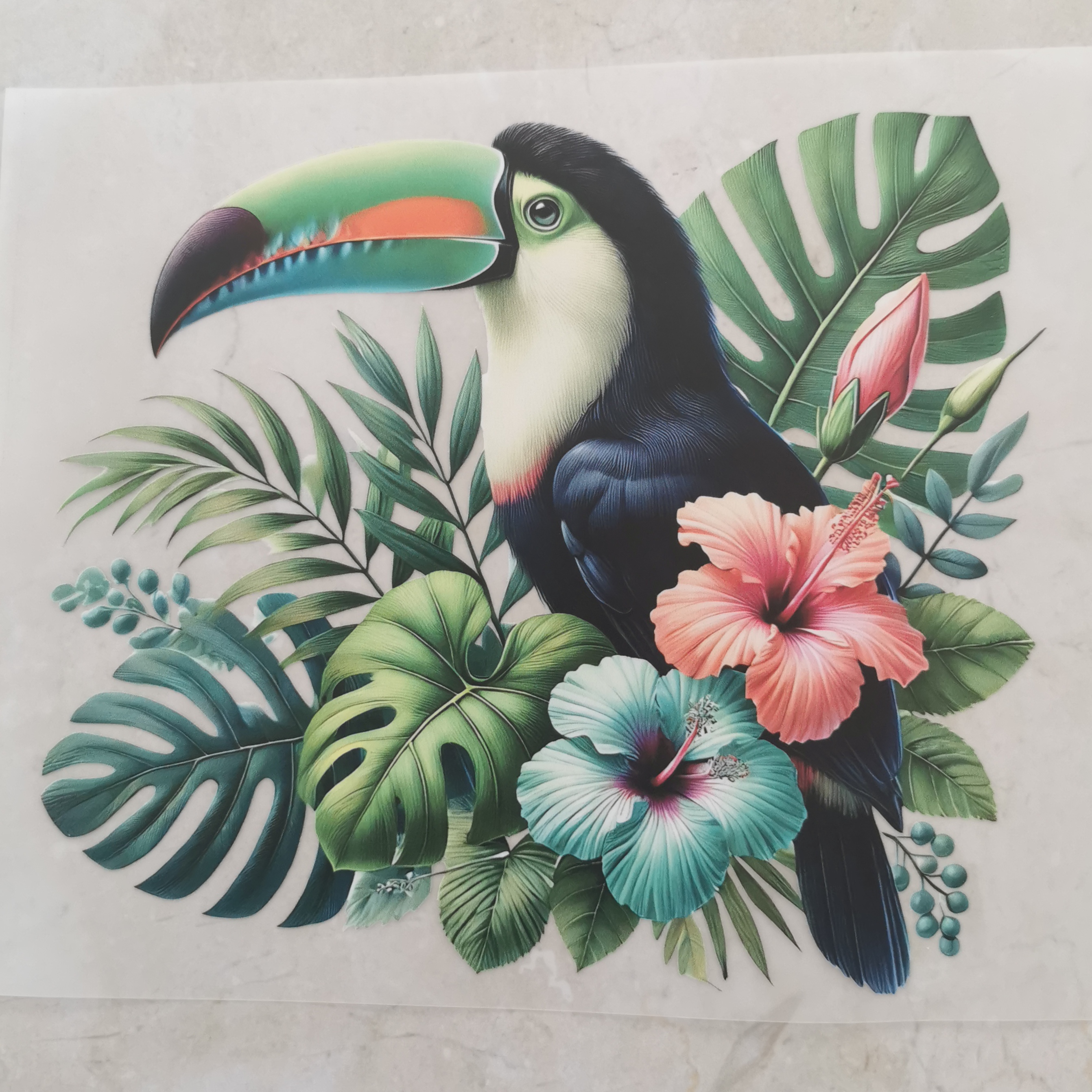Bügelbild floraler Tukan rosa-türkis