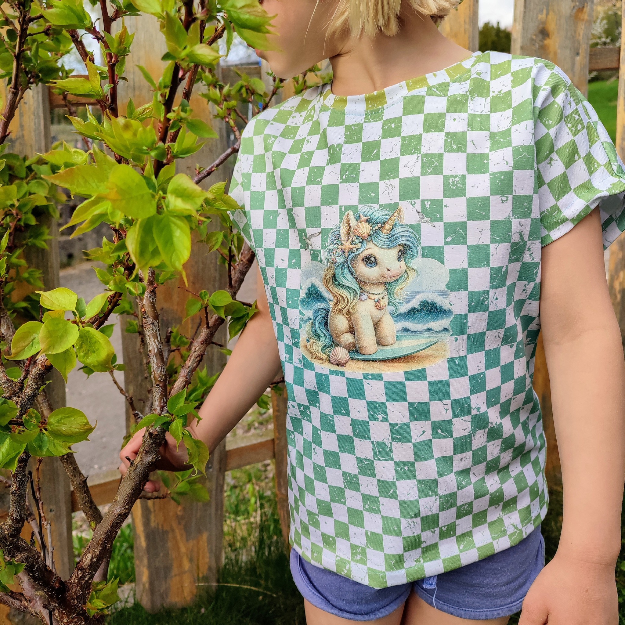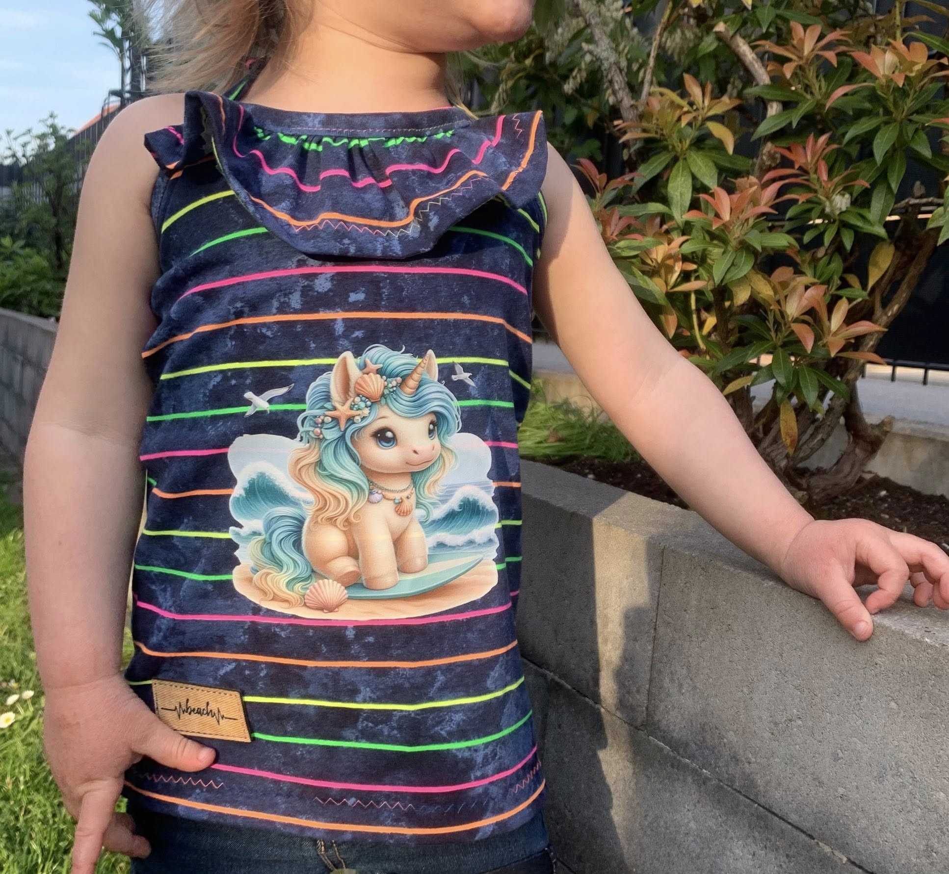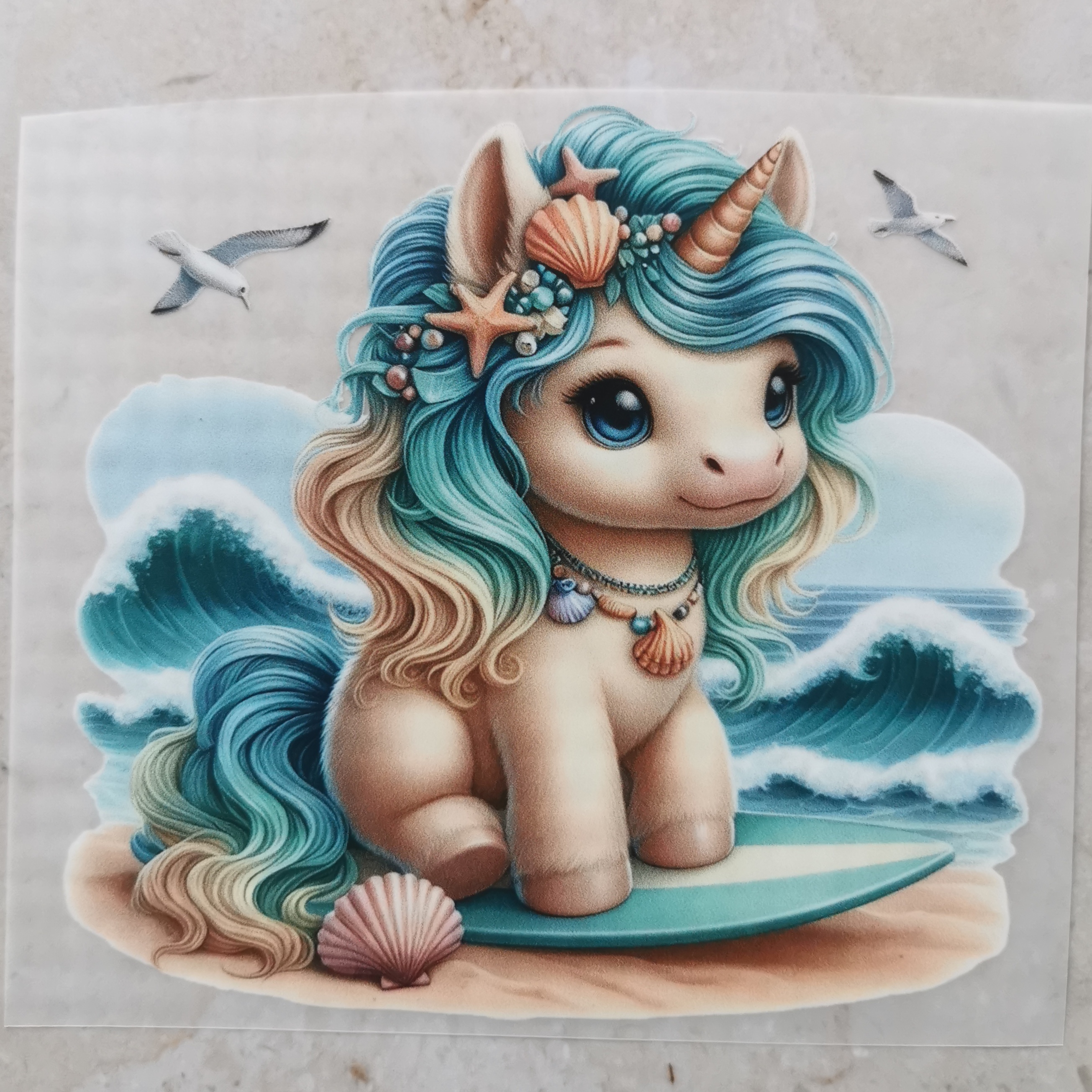 Bügelbild Strandeinhorn auf Surfbrett