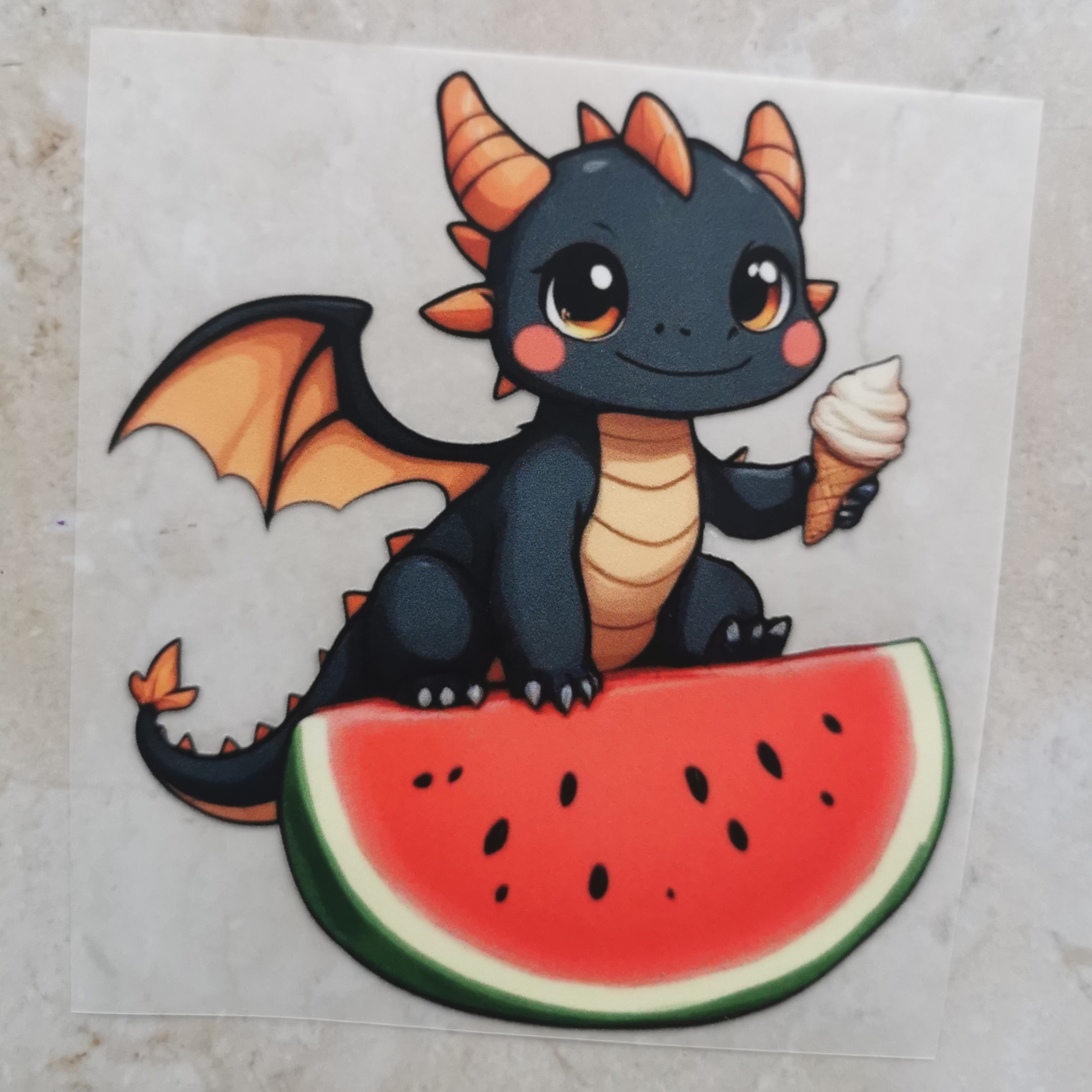 Bügelbild süßer Drache mit Eis auf Melonenstück